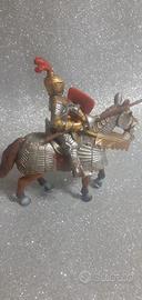 Personaggio a cavallo con armatura. Cavallo marrone. Armatura argento e oro. Pennacchio rosso. Scudo rosso. Giglio dorato. Lancia per giostra. Condizioni generali perfette!!!