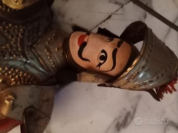 Marionetta di un Cavaliere di 64 cm di altezza con armatura oro e mantello con sciabola e scudo. Trovato in cantina . Nessuna informazione. Da pulire, ma intatto.