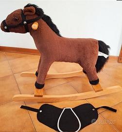Questo adorabile cavallino a dondolo non è solo un bellissimo giocattolo, ma anche un fantastico compagno di giochi per il tuo bambino! Perfetto per stimolare la coordinazione e il senso dell'equilibrio, è realizzato con una struttura solida in legno e ricoperto da un morbido peluche marrone e nero, per un'esperienza di gioco sicura e confortevole. Il giocattolo è perfettamente funzionante e in ottime condizioni, pronto a portare allegria e un tocco di magia nella stanza del tuo bambino. Caratteristiche principali: design classico: aspetto realistico con sella levabile, redini e coda in peluche, con manopole per tenersi saldo e rendere il gioco più sicuro. Materiali di qualità: base robusta in legno e rivestimento morbido e sicuro per i bambini. Benefici per lo sviluppo: aiuta a migliorare l'equilibrio e la coordinazione motoria. Condizioni: usato ma in ottimo stato e perfettamente funzionante. Regala al tuo bambino ore di divertimento e avventura con questo cavallino a dondolo! Misure: Altezza da terra alla sommità della testa: 50 cm, lunghezza: 64 cm Larghezza: 28 cm-