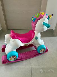Unicorno della clementoni con suoni canzoni e musiche, possibilità di scegliere se a dondolo o urilizzabile anche a ruote.