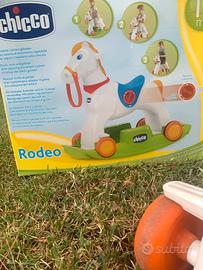 Cavallo a dondolo Rodeo marca Chicco usato ma in buone condizioni (vedere foto). Adatto dai 18 mesi di età è un gioco divertente, stimolante. Si trasforma facilmente ed offre diverse funzioni di gioco: dondolo e cavalcabile. La pratica base lo rende un dondolo funzionale da usare in autonomia e sicurezza. Quando il bambino avrà acquisito la giusta padronanza motoria, la base può essere rimossa e il cavallo a dondolo diventa un cavalcabile indipendente con cui il bambino potrà divertirsi. Ritiro a Catania centro città.