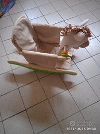 Cavallo a dondolo in legno, con bordo, poggiapiedi e appogggiamani.