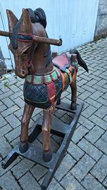 Cavallo a dondolo in legno massello intarsiato e colorato. Mai utilizzato. In ottime condizioni. Misure , lunghezza 1.25 cm altezza 80 cm . Non disponibile per la spedizione.
