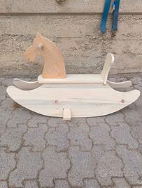 cavallo a dondolo per bambini fatto in legno assemblato in maniera artigianale con legname di vario genere incollato assieme oppure anche tutto uguale non il solito cavallo comprato in plastica.
