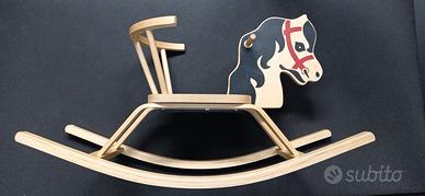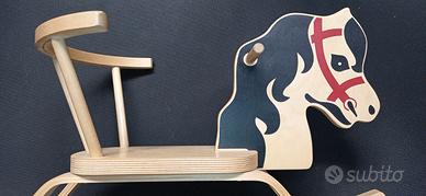 Seggiolino con cavallo a dondolo in vero legno, in ottime condizioni. Solo piccoli segni di usura. Per bambini e bambine da almeno 1 anno. Gioco classico con funzionamento a spinta. NON elettrico. Marchio CE, vero legno da foreste certificate. Disponibile subito.
