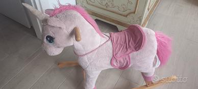 cavalluccio a dondolo a forma di unicorno rosa . Usato ma può fare divertire ancora delle bambine .