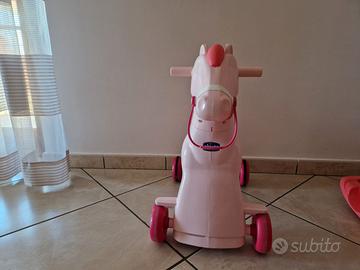 Cavallo rosa cavalcabile 3 in 1, con la base funge da dondolo, senza base si cavalca e si regola l'apertura delle gambe e consente al bambino di cavalcarlo e avanzare.