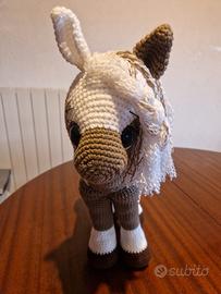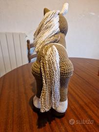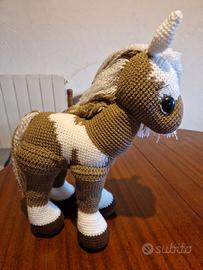Un adorabile cavallino realizzato all'uncinetto, perfetto per decorare o come giocattolo. - Realizzato a mano. - Design a forma di cavallo con criniera e coda. - Colori marrone e bianco. - Altezza 43cm.