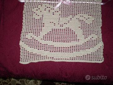 Grazioso centrino raffigurante un cavallino a dondolo per bimbi in stile antico e una fascia di fiori sopra, è fatto a mano all'uncinetto con lavorazione a filet, è stato poi arricchito con un nastrino rosa a passanastro che si unisce al centro formando un fiocco (se si mette un nastro celeste diventa per maschietto), si può realizzare anche in rosa per bimba o in celeste per bimbo. Incorniciandolo si può fare un bel quadretto da appendere nella camera della bimba, adatto per essere regalato per un Battesimo, in occasione della nascita o del 1° compleanno è stile vintage e Shabby. Disponibili 1 centrino per maschietto con un altro soggetto, cesti per presentare le bomboniere per Battesimo per bimbo ed un altro per bimba, altri prodotti per l'infanzia tra cui 1 culla Pali Cuccioli, 1 trapunta per culla, 1 passeggino leggero, 2 port-enfant, 3 ovetti/sediolini per auto, 1 vasino Chicco, giochi e abbigliamento.