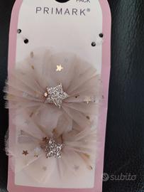 Cerchietto in velluto e due spille per capelli con stelline e tulle colore oro. Nuovi, mai usati. Completi di cartellino.