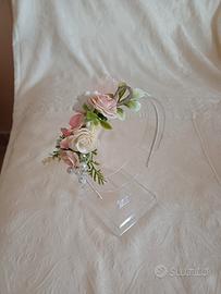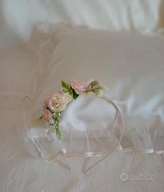 Cerchietto adatto per prima comunione, damigella, matrimonio e qualsiasi altra occasione importante. È realizzato con nastro di organza, fiori in tessuto, perle e strass. il cerchietto è in acciaio sottile rivestito con nastrino