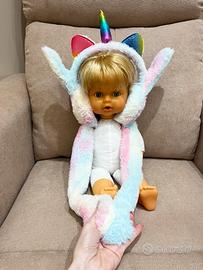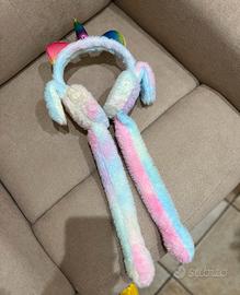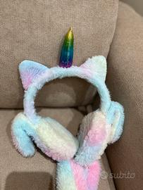 Cerchietto morbido in peluche a tema unicorno, ideale per bambini o per chi ama gli accessori kawaii e fantasy. Dotato di corno centrale arcobaleno metallizzato e orecchie colorate, con paraorecchie soffici in tonalità pastello (rosa, azzurro e bianco) che scendono ai lati come sciarpina decorativa. Premendo la fine delle due estremità si alzano le orecchie emettendo un suono. Leggero, caldo e comodo da indossare. Perfetto per: feste, carnevale, giochi, foto, idee regalo. In ottime condizioni, pulito e ben conservato. Mai usato.