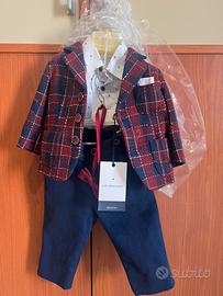 Vendo abito da cerimonia invernale da neonato taglia 6 mesi, marca Colorichiari. Prezzo di acquisto 315 euro. Usato solo per il giorno del battesimo. Lavato ed imbustato, praticamente nuovo. Pantalone blu in velluto con bretelle, giacca a quadri blu e bordeaux, camicia bianca con dettagli blu e bordeaux e papillon di velluto bordeaux. Possibilità di vendere anche le scarpette(mocassino) utilizzate solo per quella occasione e di inviare altre foto