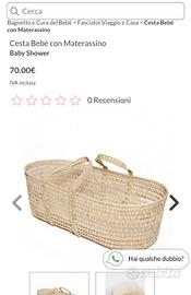 Cesta culla neonato vimini senza difetti, dim. 73 x 43 x 32 cm altezza testa x 25 altezza piedi, prezzo 35 euro, zona corso Venezia Torino Nord, possibilità di trasporto.