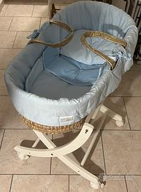 Cesta porta neonato completa di supporto a rotelle e corredino azzurro o rosa