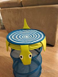 Vendo cesto porta giochi Ikea in rete, pieghevole, con manici laterali e coperchio a forma di tartaruga.