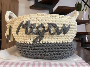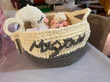 Cestino in fettuccina personalizzato In misura e colori Aggiunta nome facoltativo A partire da 25 € Questo diamentro 24 cm €45 Cestino Con manici Porta pannolini o accessori neonato