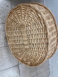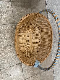 Bellissimo cesto in vimini decorato con nastro e balza azzurri.