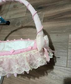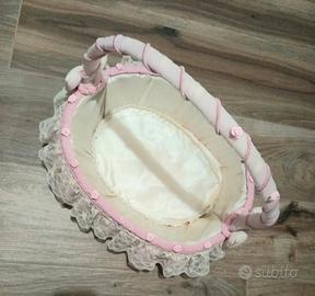 Si tratta di un cestino nascita artigianale di colore rosa, finemente lavorato a mano con tessuti, nastri e filati, spesso utilizzato per contenere prodotti per neonati o come idea regalo