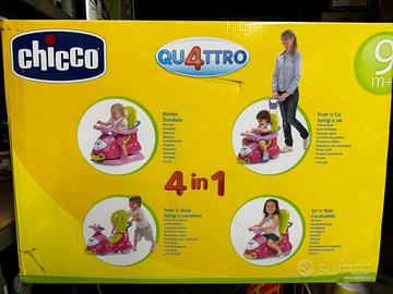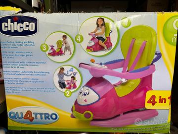 Chicco Quattro è una macchinina cavalcabile per bambini robusta e sicura, con cinture, comode protezioni per braccia e piedi e un alto schienale, 4 diverse modalità di utilizzo per seguire la crescita del bambino dai 9 mesi ai 4 anni