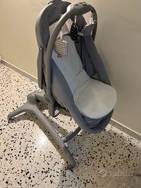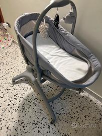 Culla evolutiva co sleeping: da culla può diventare seggiolone o sedia. Ha comode rotelle con cui può essere spostata e un pedale con cui si puo regolare l’altezza. É in perfette condizioni e disone anche di tre materassi
