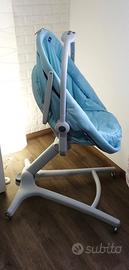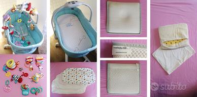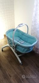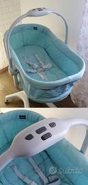 Vendo per inutilizzo Chicco Baby Hug, di colore azzurro. Adatta da 0 a 36 mesi, si può utilizzare in quattro configurazioni: culla, sdraietta rialzata, seggiolone e sedia da tavolo. Facile da spostare grazie alle ruote sulla base, è dotata di barra regolabile elettronica che emette luci e suoni (6 ninna nanne e 6 musiche divertenti), il rivestimento tessile è removibile e comodamente lavabile in lavatrice. La fornisco corredata di: cuscino anti soffocamento; cuscino per plagiocefalia marca Theraline; materassino specifico per Baby Hug con 4 fodere coprimaterasso (2 bianche, 1 rosa e una con fantasie colorate); vari giochi e ciondoli da appendere come in foto.