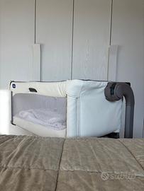 Culla next to me usata pochissimo, completamente sfoderata e igienizzata, ricondizionata come nuova. Colore white snow. Con funzione dondolio, altezza regolabile con un semplice pulsante, inclinabile in posizione antireflusso, 4 ruote girevoli con freni.