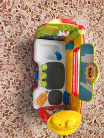 Si trasforma da cucina a un furgoncino con ruote funzionanti.Include suoni realistici di cucina,melodie e frasi in 2 lingue(italiano,inglese) per insegnare lettere e numeri.usato poco e conservato bene