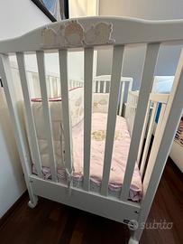 Lettino realizzato in legno massello di faggio e verniciato con vernici atossiche. Sponda regolabile in altezza. 4 ruote piroettanti di cui 2 con freno e un cassetto estraibile. Rete a doghe in legno di faggio. Colore, bianco.