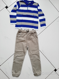 Polo a strisce azzurre, verde del pantalone e bianco. Manica lunga .