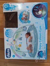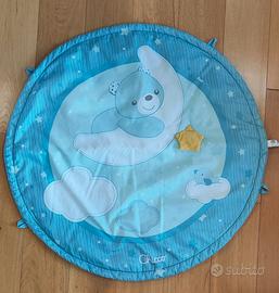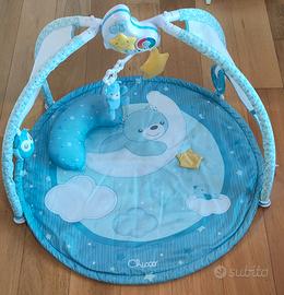 La Palestrina dei Colori offre 3 modalità elettroniche, 2 configurazioni per il giorno in base all'età del bambino e 1 per la notte, utilizzando il solo pannello elettronico, con melodie e proiezioni. Il pannello a forma di luna diffonde melodie rilassanti e proietta stelline con cambio automatico di colori; luci e musiche sono attivabili separatamente e con timer per cicli di 15 o 30 minuti Si possono selezionare 30 minuti di musiche e proiezioni di luce tra 3 diverse combinazioni: Divertimento e gioco, Relax e Intrattenimento Il modulo a forma di luna è removibile dalla palestrina e si può posizionare comodamente sul comodino per accompagnare il bambino nel momento della nanna anche con l'apposita funzione luce notte Il soffice tappeto ha grandi dimensioni (83 cm diametro) ed è dotato di un cuscino morbido ergonomico, ideale per giocare a pancia in giù o da seduti; tappeto, cuscino e giochi in tessuto sono lavabili in lavatrice. Usata pochissimo, Ottimo stato,solo la scatola un po' danneggiata.