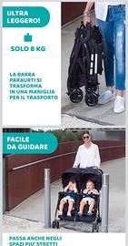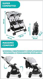 Chicco OHlalà Twin Passeggino Gemellare Doppio da 0 Mesi a 15 kg, Passeggino Leggero Reclinabile e Pieghevole, Poggiagambe Regolabili, Parapioggia e Capottina Estendibile Silver Cat, Grigio