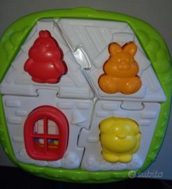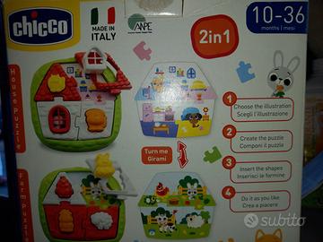 Chicco gioco Puzzle evolutivo 2 in 1. È stato progettato per sviluppare le abilità manuali e logiche del bambino, in collaborazione con ANPE (associazione nazionale pedagogisti italiani). Dai 10 ai 18 mesi il bambino potrà divertirsi ad osservare e prendere le formine del puzzle; dai 18 mesi potrà iniziare a mettere gli animaletti al posto giusto; dai 24 mesi potrà giocare e sperimentare in autonomia!! Ci sono 2 cartelle con immagini differenti, il bambino potrà divertirsi ad inserire le forme nei fori giusti. Il set completo è fornito di una cornice, 2 cartelle illustrate, 8 pezzi di puzzle e 8 formine. Sviluppa la coordinazione occhio/mano e capacità logiche. Fatto in Italia. Colori vivaci e stimolanti. La scatola originale è un po' danneggiata, il gioco all'interno è perfetto. Dotato di istruzioni. Visionabile e ritirabile di persona a Torino in zona Crocetta o Santa Rita.