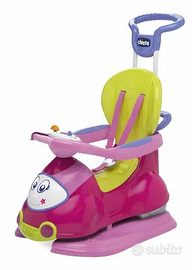 Chicco Primi passi 4 in 1. Macchinina con 4 diverse modalità di utilizzo per seguire la crescita del bambino: 1. Dondolo, adatto ai più piccoli grazie alle stabili basi basculanti, ai poggiabraccia protettivi e alle cinture di sicurezza. 2. Spingi e Vai, con poggiapiedi, cintura di sicurezza e pratico manico che permette all’adulto di spingere e guidare la macchina. 3. Spingi e Cammina, aiuta il bambino a sostenersi mentre muove i suoi primi passi offrendogli un comodo appoggio nella maniglia posteriore. 4. Cavalcabile, permette al bambino di spingersi in autonomia con il movimento delle gambe.