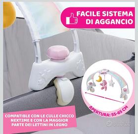 ARCO LETTINO ELETTRONICO: Dagli 0 ai 6 mesi, fissandolo alle estremità della culla, l’arco lettino rilassa il bambino nella culla con musiche classiche, 3 pendenti e una dolce luce bianca; sul tessuto si crea un arcobaleno di luci, suoni e colori