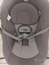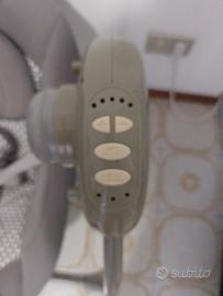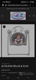 Chicco Relax & Play. Dispone di un movimento oscillante automatico regolabile su 5 diverse velocità. Include una barra gioco rimovibile con peluche e riproduce 12 melodie rilassanti o suoni della natura. La seduta è reclinabile in 2 posizioni e dotata di una cintura di sicurezza a 5 punti. È progettata per l'uso dalla nascita fino a un massimo di 9 kg.