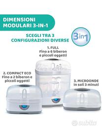 3 IN 1: scegli tra 3 configurazioni a seconda delle dimensioni: Full Size (fino a 6 flaconi da 330 ml) e Compact (fino a 2 biberon da 330 ml, 1 tiralatte o ciucci) e microonde