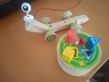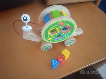 Chiocciola in legno marchio Hape (Germania) con formine colorate da incastrare nel guscio. Quando è trainata il guscio ruota e la coda si alza e si abbassa