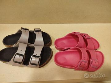 Coppia ciabatte Birkenstock. Un paio in cuoio e secondo paio in plastica. Entrambe nr. 28 con vestibilità grande.