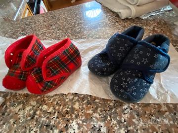 Due paia scarpette primi passi da casa in panno caldo per bimbi. Le blu n. 20 , le risse penso iano n.19 perche sono in po piu piccole (non c’è numero). Alle rosse bisogna mettere un cordoncino per legarle. Vendo in blocco