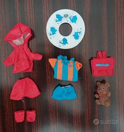 Bambolotti e accessori in ottime condizioni, usati pochissime volte. Alcuni accessori presentano dei difetti: il tessuto dell'impermeabile rosso, con i relativi calzoncini e le scarpette, è un po' rovinato e un ciuccetto è storto.