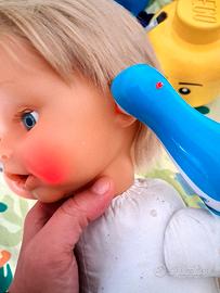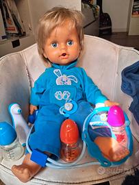 Cicciobello Bua, originale Giochi Preziosi, piange e si arrossano le guance. Smette con il ciuccio o biberon. Con i suoi accessori originali(tutina,ciuccio, termometro, stetoscopio, latte, vitemine , sciroppo . Manca la siringa). In omaggio molti accessori neonato 4 cappellini, 2 bavaglini, una tutina, 2 sonagli , ciucci primi denti, etc)ed un carrellino spesa con manico allungabile e rotelle.
