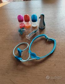Cicciobello Bua, Bambola Interattiva di Giochi Preziosi con accessori. Giochi Bambini 2 anni. Fornito con accessori originali per la cura come termometro, stetoscopio, biberon, due biberon con medicina, ciuccio, siringa (manca lo stantuffo). Oltre alla tutina blu originale, viene venduto con anche una tutina bianca e rosa di ricambio e golfino rosa. Funziona con tre pile stilo (non incluse). Funzionante e in ottime condizioni
