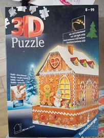 Puzzle 3D Casetta di pan di zenzero. È composto da 216 pezzi in plastica, più 41 accessori. I pezzi si incastrano, senza bisogno di colla.