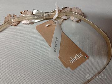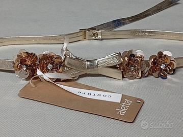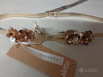 Cinturino bimba marchio "Aletta" colore oro. Sul davanti fiocco anch esso d'oro affiancato da fiori luminosi con brillantini al centro. Chiusura con fibbia dorata.