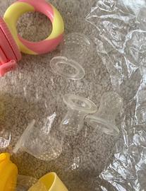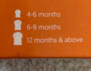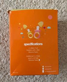 Ciucci per svezzamento. 6 tettarelle forate di 3 dimensioni diverse (2 per misura) dove è possibile mettere frutta e verdura. Usata solo poche volte una delle tettarelle più piccole, è sufficiente sterilizzare, le altre sono nuove.