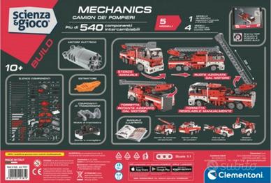 Clementoni Scienza & Gioco Build Mechanics Camion dei Pompieri. Include oltre 540 pezzi per costruire un grande camion dei pompieri motorizzato e altri quattro modelli. Il modello principale del camion presenta una scala che si alza e si abbassa manualmente, con rotazione a 360° e trazione azionate dal motore elettrico incluso. Età 10+