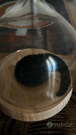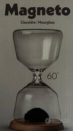 Clessidra in vetro con polvere magnetica e base in legno. Il gioco di polarità con la base trasforma la polvere in stalagmiti.