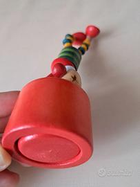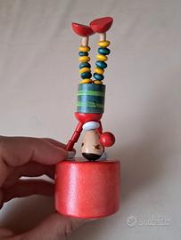 Giocattolo vintage Burattino Clown del Circo in legno con pulsante sotto (si muove, si rilassa e si radrizza). Lunghezza 12 cm. Lavorazione artigianale.