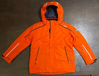 Completo sci CMP Clima-Protect bambino/bambina 10 anni, altezza 140cm, giacca arancione e pantalone blu, cappuccio rimovibile, condizioni pari al nuovo.